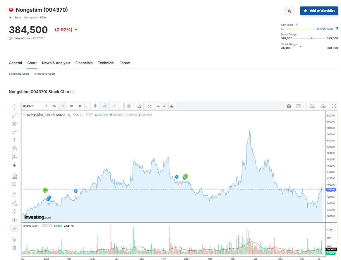 이후 2024년 현재 농심의 주가는 약 384,500원으로 거래되고 있습니다.