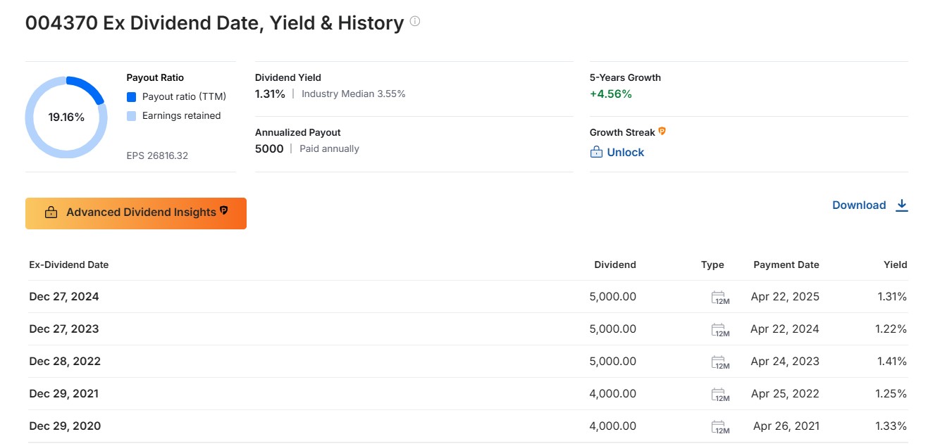 - 2024년 배당금: 주당 5,000원, 시가 배당률 약 1.31%