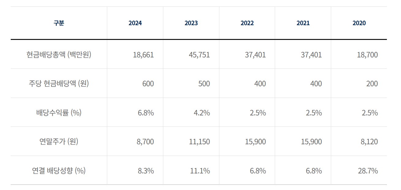- 2024년: 배당금 600원, 시가 배당률 6.8%