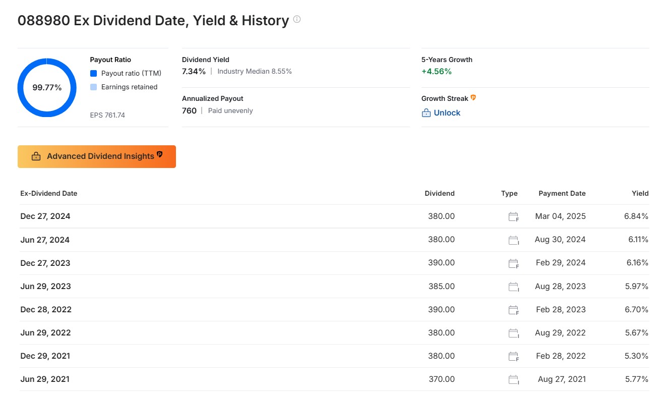 - 현재 배당 수익률은 약 7.34%로, 한국 증시의 평균 배당 수익률을 크게 웃돌고 있습니다.