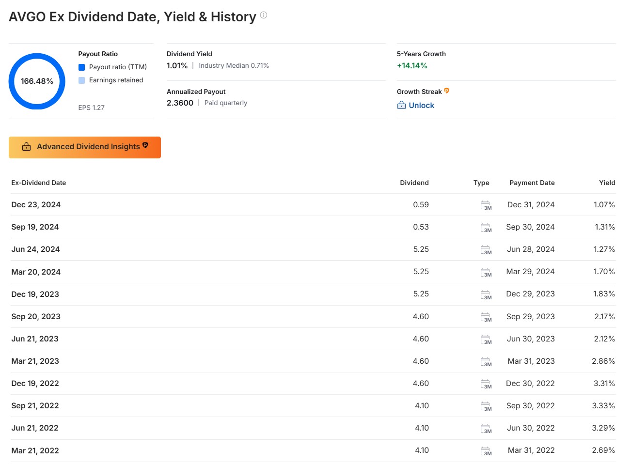- 브로드컴은 연간 배당금(Annualized Payout)으로 약 $2.36를 지급하며, 분기별로 지급하고 있습니다.
