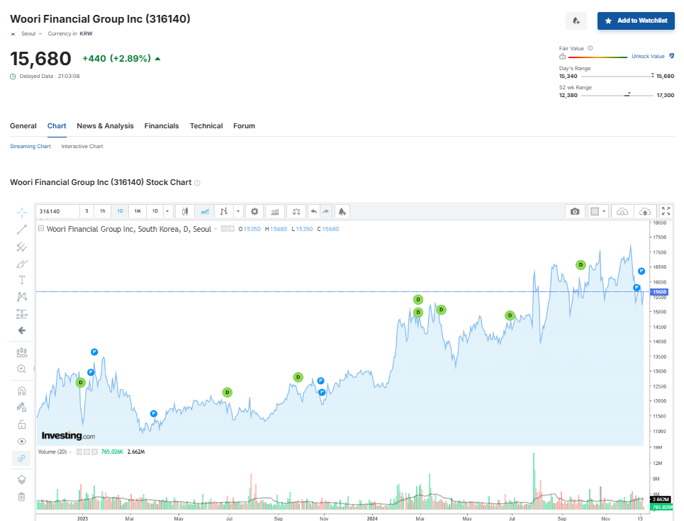 우리금융지주(316140)의 최근 주가 동향을 살펴보면, 2024년 12월 18일 현재 약 15,680원에 거래되고 있습니다. 이는 전일 대비 2.89% 상승한 수치입니다.