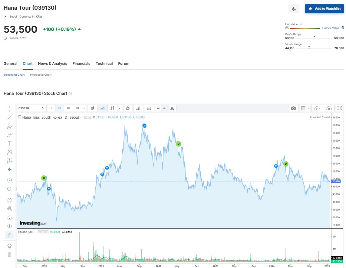 - 2025년 초: 여행 시장 회복세가 안정화되면서 주가는 약 53,500원으로 거래되고 있습니다.