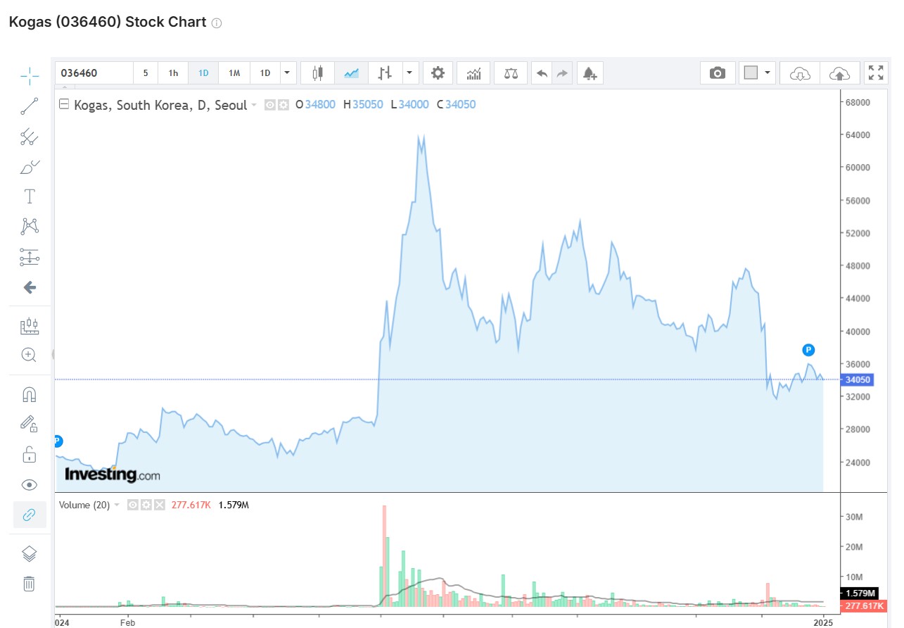 - 초기 상승세: 2024년 초반 한국가스공사의 주가는 안정적인 에너지 시장 전망과 배당금 기대감으로 상승세를 보였습니다.