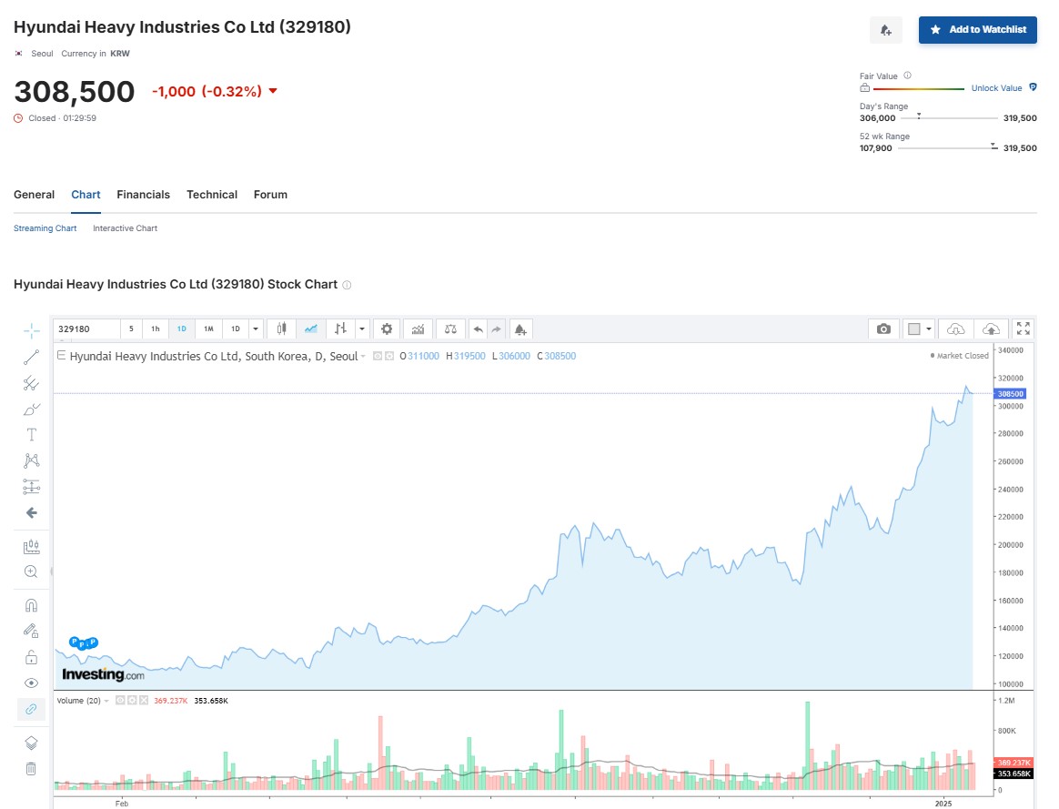 첨부된 차트에 따르면 HD현대중공업의 주가는 2024년 하반기부터 급격한 상승을 보였으며, 특히 2025년 초반에 주가가 310,000원 대를 돌파하며 52주 최고가(319,500원)에 근접하고 있습니다.