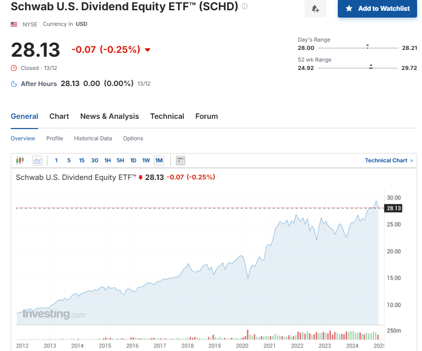 SCHD(Charles Schwab U.S. Dividend Equity ETF)는 비용 효율성이 높은 ETF로 널리 알려져 있으며, 장기 투자자들에게 매력적인 선택지입니다.